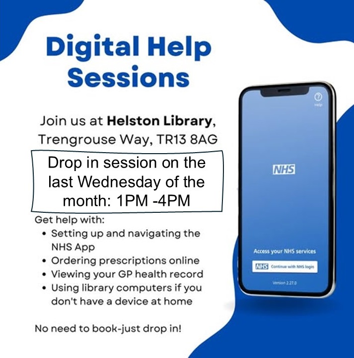 Digital health drop in session at Helston library on the last Wednesday of the month, from 1–4 PM.